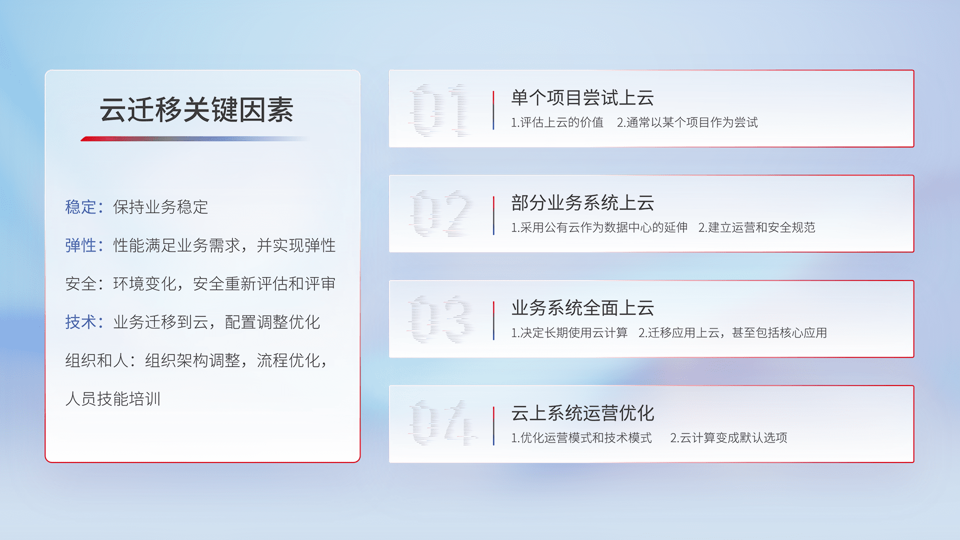 结合实际业务,,,从规划设计、、云平台选型、、云原生改造、、、、数据迁移、、、集成交付,,,,迁移全过程为客户识别最佳上云路径,,,做好风险识别管理,,,设计网络架构、、、身份权限、、、安全审计合规、、、操作审计、、、日志审计、、、、监控告警策略、、、多站点容灾设计等,,,,对云上基础设施进行整体规划,,,提升IT治理水平,,,,以满足弹性、、高可用、、、高性能的需求。。。